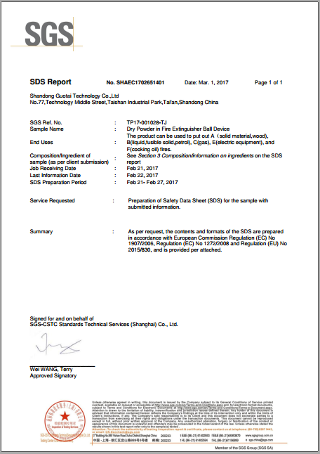 國泰科技“干粉滅火球裝置中的干粉”于近日取得由SGS檢測機(jī)構(gòu)出具的SDS報(bào)告(報(bào)告編號(hào):No.SHAEC1702651402)。