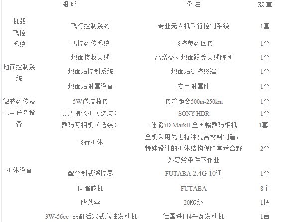 “CY-01V”型無人機系統組成包括2套飛行平臺(每套無人機機體都包括完備的飛控系統和相關設備,均可隨時獨立投入使用),1套地面控制系統(包括計算機、控制軟件、其它地面輔助設備)。