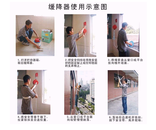 (1)選好跳落窗口或陽臺,將救生繩一端安全懸掛在窗口或牢固固定在建筑物上,將繩盤拋下地面,處于待用狀態。