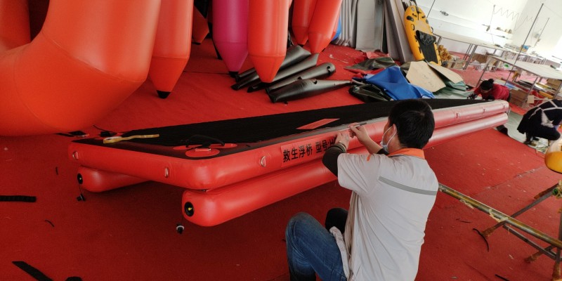海昌救生充氣浮橋符合GB/T3923.1-2013和HG/T 2580-2008相關技術規范要求,主體采用20cm拉絲氣墊,底面增設耐磨材料,正面增設可快速拆卸及更換的防滑材料。前端圓形設計減少在水中的行駛阻力,后部燕尾設計可讓救援人員方便操作。救生浮臺底部設計的兩條龍骨,可減少水中前行的阻力。充氣展開后可通過前后、橫向搭接的方式,迅速建立水面、冰面、泥地、沼澤、濕地和其他不穩定地形的救援平臺和浮動碼頭。可利用牽引鉤環在其他機動船艇后拖拽前行,更加適合人員及物資的快速轉運。采用國際先進粘合技術保證氣密性,具有耐老化、防紫外線等卓越性能。充排氣閥帶有自鎖功能,低壓操作安全可靠。救生浮臺周圍有反光條,在黑暗環境下便于識別。兩邊有救生繩索,前后及左右設有柔性連接固定帶便于搭接。