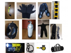 潛水服及潛水手套主體材料由CR(5mm氯丁發(fā)泡橡膠雙面復(fù)合美加布)膠接縫制而成。壓鉛:約8kg。
