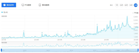 可見從2011年至2016年,全世界對無人機的關注度在整體上出現遞增的趨勢。相比幾年前,其關注度呈現幾何級別遞增。