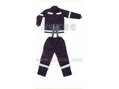 特點:用阻燃線縫制,主要線縫雙針埋夾確保牢固;領子可翻換式直立衣,并外有一搭攀用兩塊魔術帖封閉;下擺有兩口袋,有袋蓋并用魔術貼封閉;前胸有一工具袋;袖口內(nèi)置羅紋袖;帶褲腰部以橡皮筋收緊,兩側各有一側插口袋;褲膝各有一塊貼墊.褲腿有內(nèi)置橡皮筋收緊.裝3M Scotchlite® 銀色阻燃反光帶,增加消防人員的可見度。