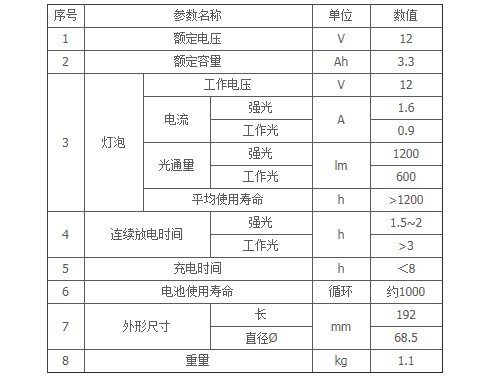 ● 特制高色溫燈泡壽命長,光效高、耗能少,光斑光色均勻;強光光通量1200流明,射程達600米,連續工作時間約2小時;工作光光通量600流明,連續工作時間不低于3小時。