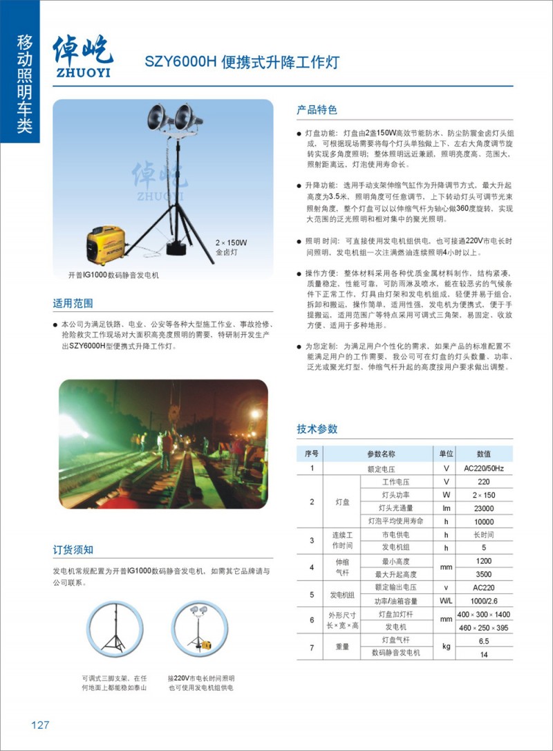光源功率 2x150w 主要適用范圍大型施工作業、工程搶修、災情搶險、消防照明、警案現場、事故處理等夜間工作現場對大面積、高亮度照明的需要