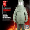 消防員避火防護服是消防員進入火焰區域短時間滅火或關閥作業時穿著的的全身防護服裝。其防護性能是嚴格按公安部配備標準的要求而設計的,符合Q/02MKF002-2005《消防避火服》技術標準,并可提供第三方檢測報告。該服裝主要由雙層絕熱高硅氧玻璃纖維(耐火極限1700度)、耐火纖維布、耐火碳纖維氈、隔熱防火層、隔熱層、舒適層等7層材料組成,具有良好的耐火、隔熱性能。