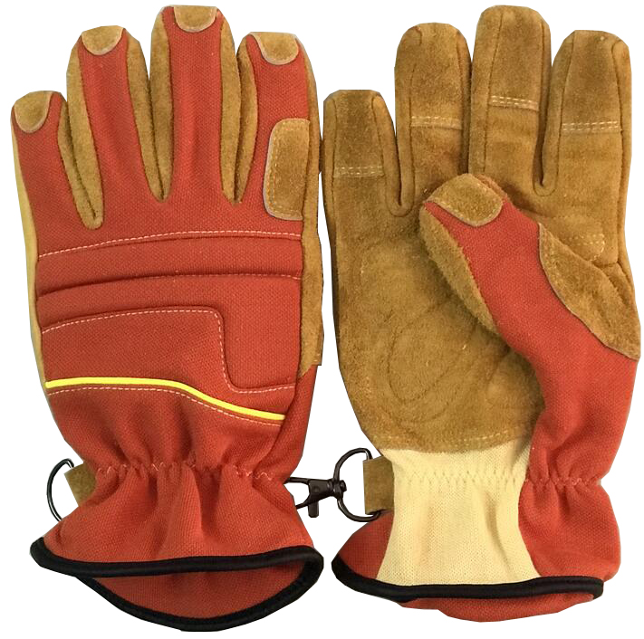 此款消防員搶險救援防護手套采用3D立體式設計、具有極強的立體感效果,手掌指尖采用一片式翻轉手指背,同時手掌帶減震海綿,整個手套顏色為橘紅色和黃色,手套材質為牛頭層皮和芳綸針織布,執行GA633-2006《消防員搶險救援服裝》標準。
