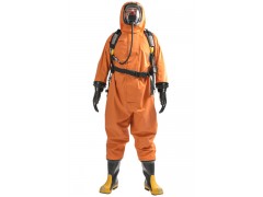 2、半封閉式結構,由連體帽、化學防護服、防護靴、防護手套等部分組成,可與空氣呼吸器等設備配合使用;