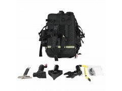 背負式電動破拆工具組由6件設(shè)備單元組成,包括電動液壓泵、剪切器、擴張器、開門器、撬棍和腰斧。液壓電動泵的有線控制器上具有照明功能。有線控制器的前端裝有LED燈,有線遙控器上帶有LED顯示屏,顯示電壓、電量、溫度和功率。遙控距離>100m,200m(空曠地帶)