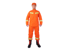 產品符合GA633-2006《消防員搶險救援防護服裝》標準要求。采用180g橘紅色芳綸斜紋面料制成。夏季服裝采用襯衫式上衣配長褲設計,使用國外引進的紡紗、織造、縫紉和檢測設備,用先進的紡織、整理工藝加工而成。本產品具有阻燃、防靜電、耐磨、牢固、透氣吸汗、輕便、抗拉力強、穿著舒適、顏色及標識醒目等優點。