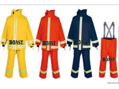 另有配套的:消防頭盔、腰帶、消防靴、消防手頭和呼吸器。材質:PVC復合布。