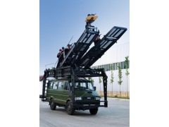 “中天之星” 依維柯多功能反恐突擊車是反恐作戰特別是反劫持反劫機作戰中最先進最有效的特殊裝備,由依維柯2045越野軍用車底盤與可拆卸式多功能伸縮攀登平臺系統組成,底盤具有較強的載重能力與良好的機動性能,整車具備快速攀登、跨越障礙物與登高狙擊功能,其爬梯升起最大高度超過10米,最大水平跨越寬度超過5米,跨越障礙高度超過3米。它的最大特點是能夠快速而穩定的將多名突擊作戰人員同時輸送到不同的作戰突破口。反恐突擊車在運行作戰過程中,兩側和后部戰術踏板及車頂作戰平臺可以同時搭乘近20名突擊作戰人員。其接觸高度為9-11米,最大水平長度8米。實戰是可以從正面及側面同時進行突擊,能在10秒鐘內將突擊隊員送到3層樓的窗口,并可同時接近2層、3層及翻越4層窗口,該系統可以跨越3米寬度的障礙。該系統還具有防彈掩體、輔助戰術梯、前端攝像監控等功能配置。在伸縮攀登梯前端安裝狙擊手平臺,可以將狙擊手升高到預定位置隱藏觀察與狙擊。通過安裝在伸縮攀登梯戰術平臺的視頻監控攝像頭與車內視頻監視器,車內駕駛員與乘員觀察突擊現場的情況,便于整車的操作。通過前后四個升降支腿,可以使車頂攀登平臺獨立支撐起來,底盤車可以單獨行動,提高了裝備使用率。全部系統的安裝與拆卸在30分鐘內可以完成。